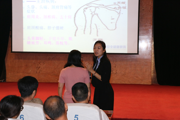 在中國環境健康與衛生安全促進會河北分會的大力支持下,中國安全健康教育中心河北站特邀講師,全民健康咨詢服務部,省健康教育專業委員會委員,宣傳科講師彭一茹走進中太大廈,圍繞CPR現場緊急救護知識;環境污染、室內污染的危害及防護知識;經絡穴位養生;常見職業病的防治;家庭醫療設備的正確區分等內容,從實際案例出發,深入淺出、形象生動的剖析健康的重要性以及穴位養生保健的方法,同時還邀請現場員工代表上臺,與老師合作為現場員工形象的解析了經絡穴位治療的原理及療效。彭一如老師的精彩授課得到了在場員工的一致認可。