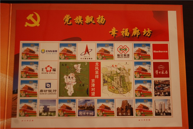 6月3日上午,由廊坊市委宣傳部與廊坊市郵政局共同推出的《黨旗飄揚 幸福廊坊》個性化郵票在廊坊市博物館舉行首發(fā)式。《黨旗飄揚·幸福廊坊》個性化郵票共“1+12”幅圖案。“1”即中心主圖案,體現(xiàn)廊坊市“龍鳳呈祥,京津?qū)ν钡膮^(qū)位優(yōu)勢,“12”即12幅輔圖,其中4幅分別為會展中心、居民小區(qū)、文化藝術(shù)中心、中央生態(tài)城,體現(xiàn)“智能、生態(tài)、商務(wù)、休閑”的廊坊