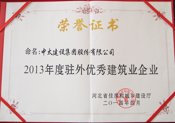 日前,由河北省住房和城鄉建設廳主辦的關于評選2013年度駐外優秀建筑業企業和優秀項目經理的活動結果揭曉,中太建設集團以突出的綜合實力和良好的社會口碑,被授予“2013年度駐滬優秀建筑業企業”榮譽稱號,項目經理石鋒德以優異的工作成績和惟以求真的工作態度被光榮評選為“2013年度駐滬優秀項目經理。”
