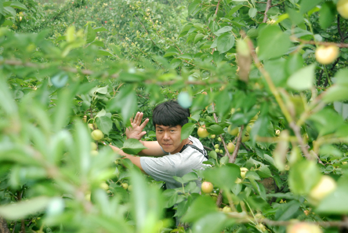 盡管空氣潮濕,路面濕滑,但阻擋不了大家采摘的熱情。面對著綴滿枝頭的杏兒,大家早就沒有平日里的文雅和羞澀,翹腳、彎枝,瞄準了那大個地、泛著紅暈的京白杏兒,熟練地采摘。